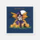 Cute black haired fairy all in purple sitting amongst a pumpkin patch during a full moon with her cute little black cat