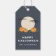 Attach our festive tags to your Halloween party favours, treat bags and more for a custom touch. Modern design features a midnight sky background with a full moon rising over a pumpkin patch filled with vibrant orange pumpkins. "Happy Halloween" appears beneath in bold, modern white lettering. Personalise with your name(s) or custom message using the field provided. Tags reverse to solid white for easy writing.