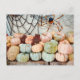 The design features a pile of pastel and rustic pumpkins in shades of sage green, peach, and cream, surrounded by a festive spider web and a playful Halloween spider. Perfectly blending the cosiness of harvest season with a hint of Halloween mystery, this postcard makes a delightful keepsake or a charming seasonal greeting.