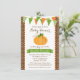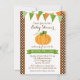 A fall themed baby shower invitation featuring a pumpkin and pennant banner design. This cute autumn baby shower invite is in fall colours of orange, green and brown. Easily personalise for a boy or gender neutral baby shower party.