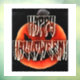 This graphic drawing, has been photo-edited, to enhance, this Menacing, pumpkin image, grinning, in orange, yellow, black, and grey, colours-with Happy Halloween, Emblazoned, across the front, in macabre, white lettering.