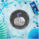A transluscent, silvery white glass pumpkin with a blue stem is set on a grey background and framed with a pretty floral scroll frame in silver. Very pretty, very classy.