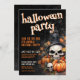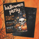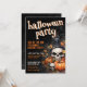 Welcome guests to your annual Halloween costume party with this dark and moody invitation featuring a spooky, gothic-inspired design. Set against a distressed black background, the fonts are a mix of orange and off-white, with "Halloween Party" styled in a spooky, eerie font to set the tone. On the right side of the invite, a stack of black vintage rustic books is paired with orange pumpkins, jack-o'-lanterns, and skulls—one of which wears a crooked witch hat for a fun, eerie twist.