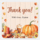 Get in the spirit of the season with this pumpkin spice-themed sticker. Autumn leaves fall around the beige-panelled background to thank guests for coming to the cosiest fall bridal shower ever. A large pumpkin, autumn flowers, candles, a pumpkin spice latte, and a cupcake complete the scene. Use the sticker as an envelope seal or as simple thank you's on favours at a fall Pumpkin spice-themed bridal shower, birthday party, anniversary party, engagement party, or other autumntime get-together. Available with matching products.