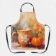 A pumpkin spice latte with a white leaf on the mug sitting beside a small pumpkin.