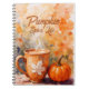 A pumpkin spice latte with a white leaf on the mug sitting beside a small pumpkin.