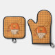A cute fall ochre pattern oven mitt and pot holder set with the doodle of a pumpkin spice latte .