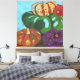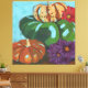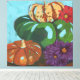 Bring the joyous beauty of a pumpkin / squash still life indoors with this reproduction of an original hand-painted artwork on canvas. This piece features a striking pumpkins dominating a lush, bright teal background, creating a dramatic contrast that draws the eye.