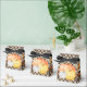 The Pumpkin Still Life Design is perfect for the Fall Season. This Favour Box features a still life of pumpkins, on the front (white, yellow and orange). The side panels have bright orange and yellow leaves. All of these elements are overlaid on a background pattern of brown and beige diamonds. On the bottom of the design there is an orange and brown band. The circle on the back can be customised for any special occasion with your own text.