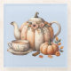 This charming autumn-themed illustration features a whimsical pumpkin-shaped teapot adorned with delicate fall florals and muted foliage, paired with a coordinating teacup and saucer. Soft shades of peach, cream, and sage green create a cosy, rustic palette perfect for seasonal décor or gifting. The composition includes classic fall elements like cinnamon sticks, dried leaves, and petite pumpkins, enhancing the warm, inviting vibe of the scene. The floral detailing on both the teapot and teacup adds a vintage-inspired touch, while the soft lighting and painterly style evoke a sense of calm and nostalgia. Ideal for lovers of cottagecore aesthetics and seasonal tea-time scenes, this design effortlessly blends cosy autumn elegance with a playful, storybook charm. AI generated artwork.