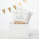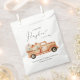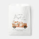 Cute baby shower party favour bags featuring "a sweet little pumpkin is on its way" in simple typography and a script with a heart swash and watercolors of a vintage pickup truck carrying orange and cream pumpkins and floral bouquets. Specify the baby’s gender if desired (e.g., "is on his way").
