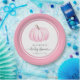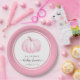 These cute minimal baby girl shower paper plates feature a pastel pink watercolor of a pumpkin, "baby shower" in a pretty stylish script, and the mother-to-be's name and shower date in a mix of modern and handwritten typography.