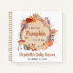 Rustic autumn-themed baby shower guest book featuring a watercolor illustration of a wreath composed of a tree trunk adorned with cute woodland animals (owl, deer, squirrel and fox), fall florals and pumpkins. A "Sweet Little Pumpkin Is On Its Way" is written in a mix of simple typography and a terracotta script. Specify the baby's gender if desired (e.g., "is on his way").