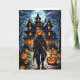 A pumpkinhead walks down the path, past grinning jack o' lanterns, on this spooky Halloween card.