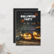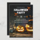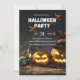 An invitation featuring spooky grinning pumpkins, skeleton heads, and orange bats.