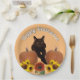 These paper plates feature cutout orange and yellow sunflowers and a cutout pumpkin on a light orange background. A black cat with crossed paws is featured in a photo cutout. "Happy Halloween" is written across the top. You can customise these with your own message. You can also replace the photo of the cat and the pumpkin and the sunflowers with your own cutout photos if desired. If you need help customising, please contact me.