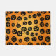 Seamless pattern design with Halloween pumpkins silhouettes on orange background.