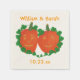 Painting of two pumpkins, sitting side by side inside a heart shaped vine, with placeholders for names and wedding date, are printed on personalised napkins. These are a fun choice for Halloween and autumn weddings.