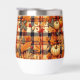 An elegant Fall design with pumpkins, fall plaids and colourful leaves.