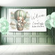 Adventure themed baby shower Welcome banner with an adorable white and tan puppy holding a teddy bear riding in a green hot air balloon. The watercolor green sky has white clouds with surrounding gold stars. Template included.