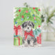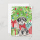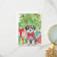 watercolor portrait of a cute puppy sitting under a Christmas tree.
