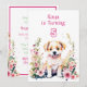 A sweet little puppy dog surrounded by pink flowers watercolor illustration birthday party invitations for a little girl.