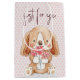 Watercolor puppy dog with pink flower on blush pink heart pattern with text.