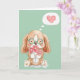 Watercolor puppy dog with pink flowers on green background with a thought bubble and pink heart.
