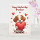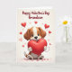 This greeting card shows a cute brown-and-white puppy with floppy ears and big dark eyes, sitting and hugging a shiny red heart balloon. The puppy’s face has a gentle, slightly upturned smile that makes the whole scene feel sweet and caring. Around it, smaller red heart balloons float upward, with a mix of see-through hearts and solid ones. Near the bottom, tiny heart shapes are scattered like confetti on a creamy off-white background. At the top, the message “Happy Valentine’s Day Grandson” appears in flowing red cursive-style letters, standing out clearly above the puppy. The simple colors and the puppy’s hug make it feel like an easy way to say “I love you” without needing a lot of words 🥰❤️. It’s a meaningful card to give because it feels both affectionate and comforting, perfect for a grandson who should know he’s cared for.