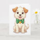 This card shows a sweet puppy centered on a bright white background, looking straight ahead with an easy, friendly expression that feels like it’s meant just for you 💚. Its creamy white fur has a soft, plush look, and its sandy-brown ears flop gently to either side, framing those wide brown eyes. The puppy’s mouth is open in a small grin, with a pink tongue peeking out as if it’s happily posing for someone it adores. Around its neck sits an emerald green bow tie covered in tiny white shamrocks, bringing a St. Patrick’s Day touch ☘️. A shiny gold heart pendant rests right in the middle of the bow, hinting at affection like a little gift worn close. The greeting text is placed above the puppy in green, with a shorter line below in lighter green that balances the layout without crowding the illustration. Soft, diffused lighting keeps the background clear and the details gentle, with the bow tie and heart pendant standing out at the center.