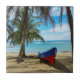 Pura Vida in Costa Rica. Boat on a tropical beach with coconut tree and the Caribbean sea in background, Puerto Viejo de Talamanca - Costa Rica