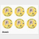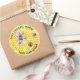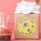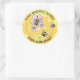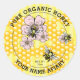 Personalised beekeeper round stickers for jars of homemade honey and other honey products. Featuring honeycomb and yellow striped background, wild apple blossom flowers and honey bees. The easy to use template allows your to personalise the text that currently reads "PURE ORGANIC HONEY" and at the bottom the product the weight and the name of your family or business.