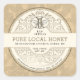 Classy ivory and taupe label with ornate 19th century French filagree design and 14th century British heraldic bee on a patterned vintage floral backdrop.