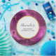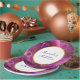 Baby Shower paper plates with a beautiful abstract design. Dark purple amethyst colour with ribbons of gold nestled between layered strata. Rich and beautiful design. Layered over top is a white circle frame with a faux gold foil border, with your personalised text inside.