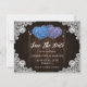 Purple and blue wedding photo save the date card featuring two floral hearts and white floral lace against the barn wood background. A single photo at the back.
