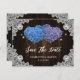 Romantic rustic purple and blue floral wedding save the date card featuring hydrangea flowers against a barn wood background adorned with white floral lace and twinkle lights.