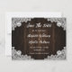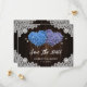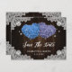 Romantic rustic purple and blue floral wedding save the date card featuring hydrangea flowers against a barn wood background adorned with white floral lace and twinkle lights.