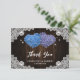 Thank your guest for sharing in your special day with this romantic purple and blue floral wedding thank you card featuring floral hearts on a barn wood background decorated with white floral lace and twinkle lights.