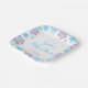 This elegant and glamourous plate features watercolor turquoise blue and purple faux glitter snowflakes and sparkles on a white background. The text combines handwritten script and modern sans serif fonts for a classy and sophisticated look. This is perfect for a winter or Christmas baby shower.