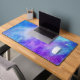 Desk mat with a cosmic abstract background. Swirling vibrant colours of light blue, pink and purple. White stars scattered around.