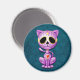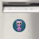 This adorable purple kitten design is decorated with swirls and dot patterns. Yellow flower pedals circle the pure black eyes in the tradition of the Day of the Dead sugar skulls. The cat is sitting down, looking forward with its tail waving in the background. The oversized head sits on a tiny body which creates a playful, cartoon like appearance. A five point star sits in the middle of the kitten’s forehead while a bright red and yellow heart appears in the centre of the chest. A shadow falls onto the deep blue background making the design appear to float just above the surface of this magnet. This cute little cat is a fun and stylish design inspired by the beautiful patterns of Day of the Dead sugar skulls.