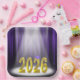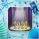 Gold 2025 text in the spotlight on stage with purple curtain background for graduation party