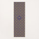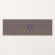 A yoga mat with a seamless repeating purple and gold quatrefoil pattern with fleur de lys symbol (lilies). With a customizable text field for your initials