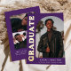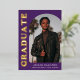 Stylish and trendy graduation announcement featuring the graduate's photo on the front with an offset arch photo frame. "Graduate" is displayed in bold gold foil lettering on a purple background. Personalize the front of the arch photo graduation announcement by adding the graduate's name, school, and graduation year. The card reverses to display an additional 3 photos with space for custom text such as future college plans, career plans, graduation party details, etc. The gold foil graduation announcement is perfect for both high school and college graduates.