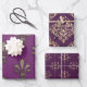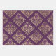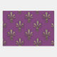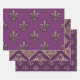 Purple and Gold Paris themed wrapping paper in three different styles including rose damask, fleur-de-lis, and chandeliers.