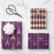 Purple and Gold Paris themed wrapping paper in three different styles including harlequin, Eiffel Tower, and crown patterns.