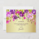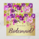 Gorgeous and glamourous bridesmaid card that will make her feel very special. It begins with a smooth gold background. Then there's the cascade of purple and pink watercolor flowers surrounded by a variety of green vines and leaves. Will you be my bridesmaid is written below in beautiful purple fonts The back of this keepsake card has the same gold and floral pattern, but with a message that you can easily customise.