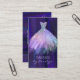 Elegant dress seamstress business card, with graphics of a lavender glitter dress, against a purple satin looking background. Personalise the text to suit your business needs. A lovely stand out card for your tailoring business.