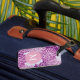 Pretty lilac and purple flower pattern on monogrammed luggage tag.