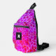 Purple and Pink Leopard Print Monogram Sling Bag. Gorgeous luxe leopard print design in feminine colours of purple and pink. Go wild in style with this vibrant bag. Perfect for lovers of animal print bags and accessories. Includes customisable monogram letter to keep or remove as you wish.